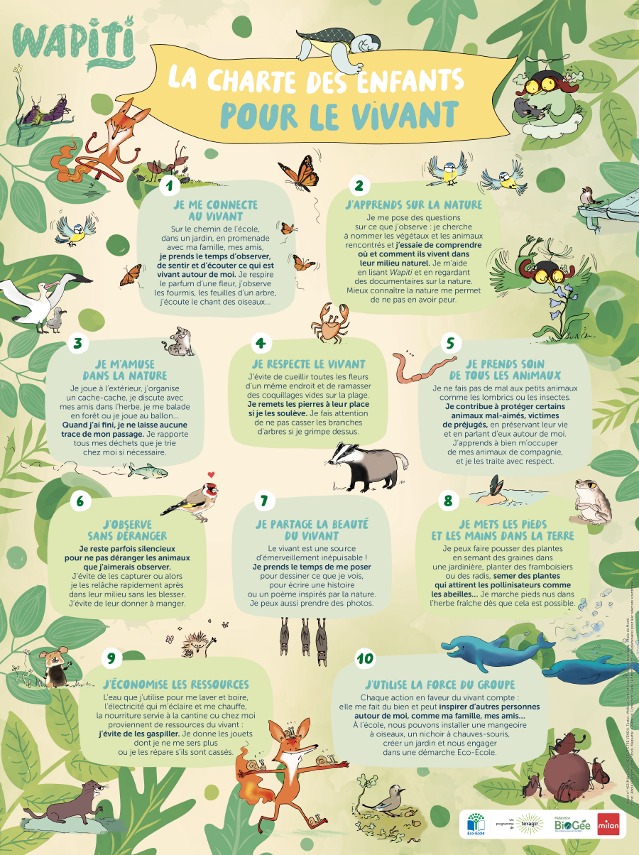 La Charte des enfants pour le vivant est née d’un partenariat entre l’association Teragir, coordinatrice du programme Eco-Ecole, le magazine Wapiti et la Fédération Biogée. Elle propose 10 règles accessibles, à afficher en classe ou à la maison, pour encourager les enfants à agir concrètement pour la nature, tout en développant leur sentiment de pouvoir d’agir et en réduisant l’écoanxiété.