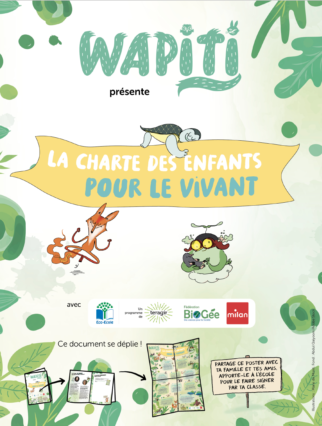 Conçue en partenariat avec le magazine Wapiti et Biogée, la charte pour le vivant ancre l’éducation à la biodiversité dans le quotidien des enfants de 7 à 12 ans. Véritable outil d’engagement à hauteur d’enfant, elle encourage les élèves à agir en coopération et aide à réduire l’éco-anxiété en cultivant une approche joyeuse et confiante de l’avenir.