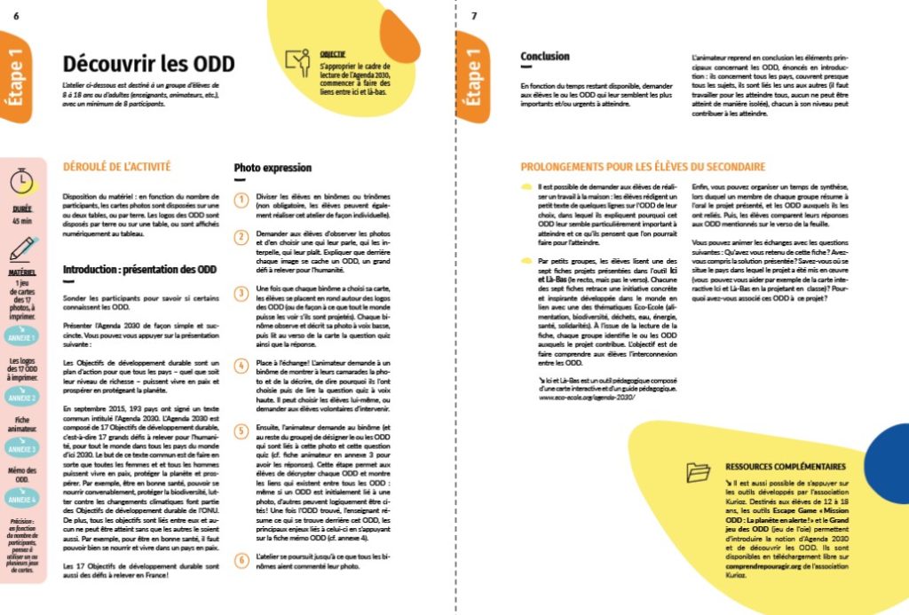 Ce guide a été créé grâce au soutien de l’Agence française de développement, et prolonge le précédent outil Eco-Ecole « Ici et là-bas », qui présentait des initiatives inspirantes à travers le monde en lien avec les ODD.