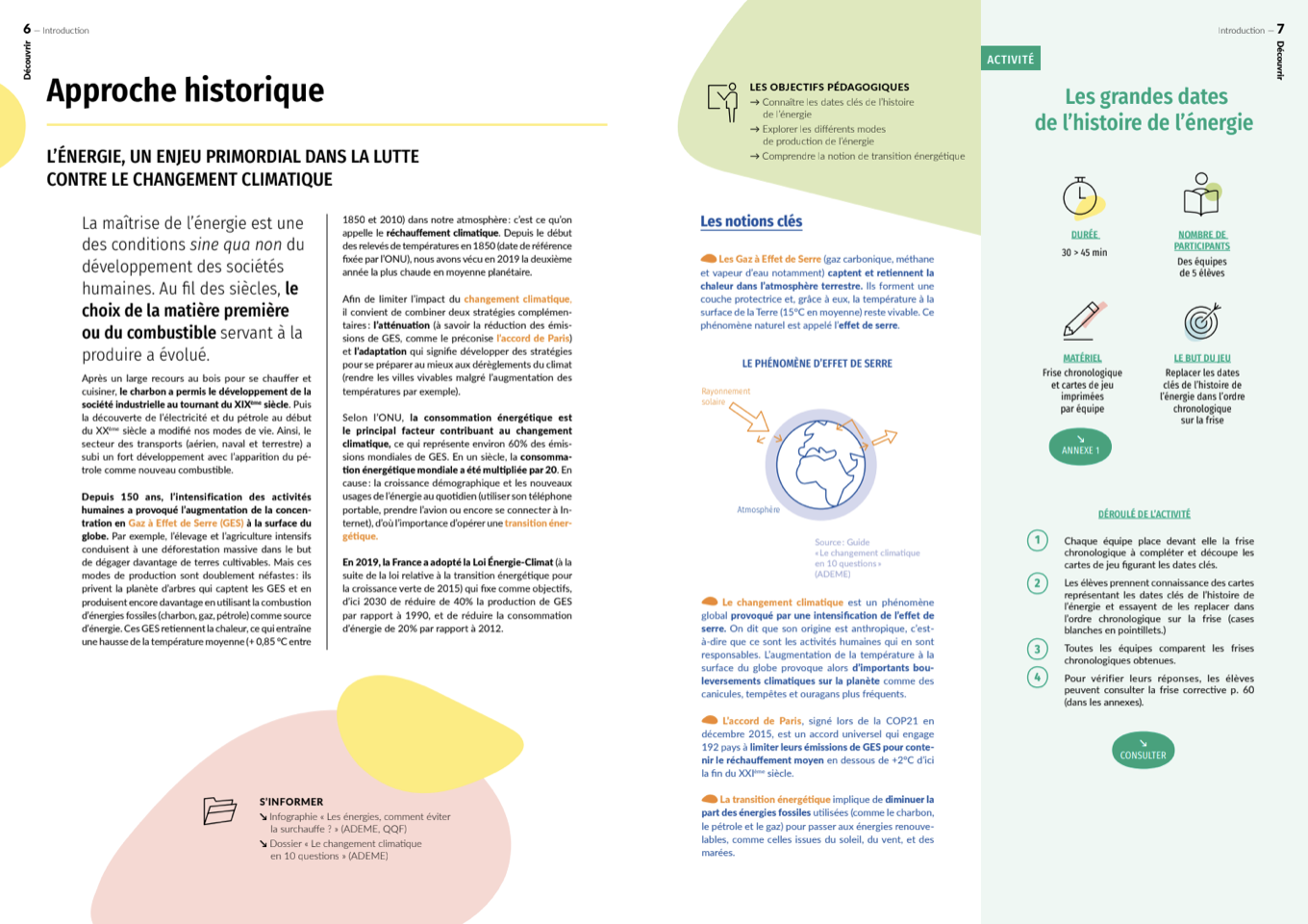 En abordant l’énergie à travers le bâti, l’alimentation, le numérique et les déplacements, ce guide permet aux enseignant.e.s et à leurs élèves de se questionner sur les enjeux environnementaux liés à cette thématique et de réfléchir à des solutions à mettre en place à leur échelle.
