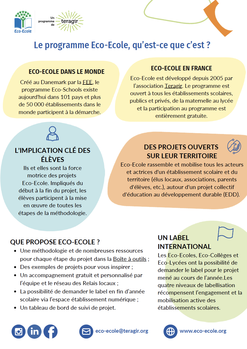 Le programme Eco-Ecole propose des ressources et un accompagnement personnalisé aux établissements scolaires qui souhaitent s'engager dans une démarche de développement durable. Si vous sentez une envie de l'établissement scolaire de se lancer vous pouvez l'inviter à s'inscrire au programme pour être guidé dans la mise en place du projet. Des supports sont à votre disposition ci-dessous pour vous aider à présenter le programme.